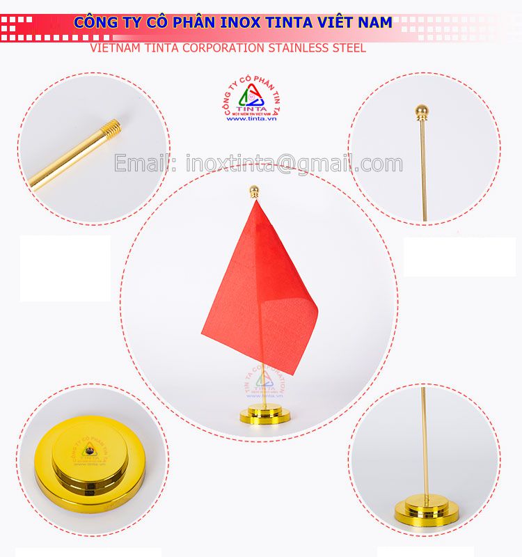 Sản phẩm của TINTA sử dụng inox mạ vàng cao cấp, bền đẹp hơn hẳn các mẫu cờ để bàn bằng nhựa hoặc kim loại thường.