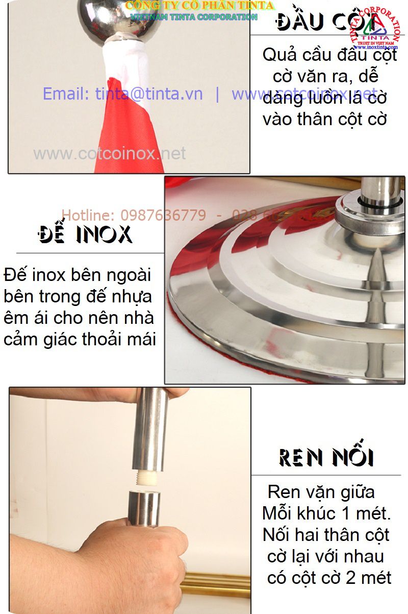 Chất liệu inox cao cấp: Cột cờ được làm từ inox SUS304 hoặc SUS201 với bề mặt trắng sáng, không gỉ sét, chống oxy hóa hiệu quả.