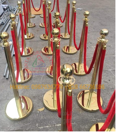 Cột chắn dây giăng inox giá rẻ dài 5m 2 3 mét xếp hàng sân bay. Mẫu trụ chắn có dây căng inox vàng dây trùng, nhung hay xích.
